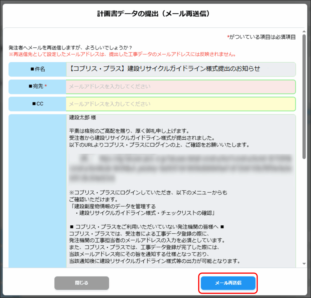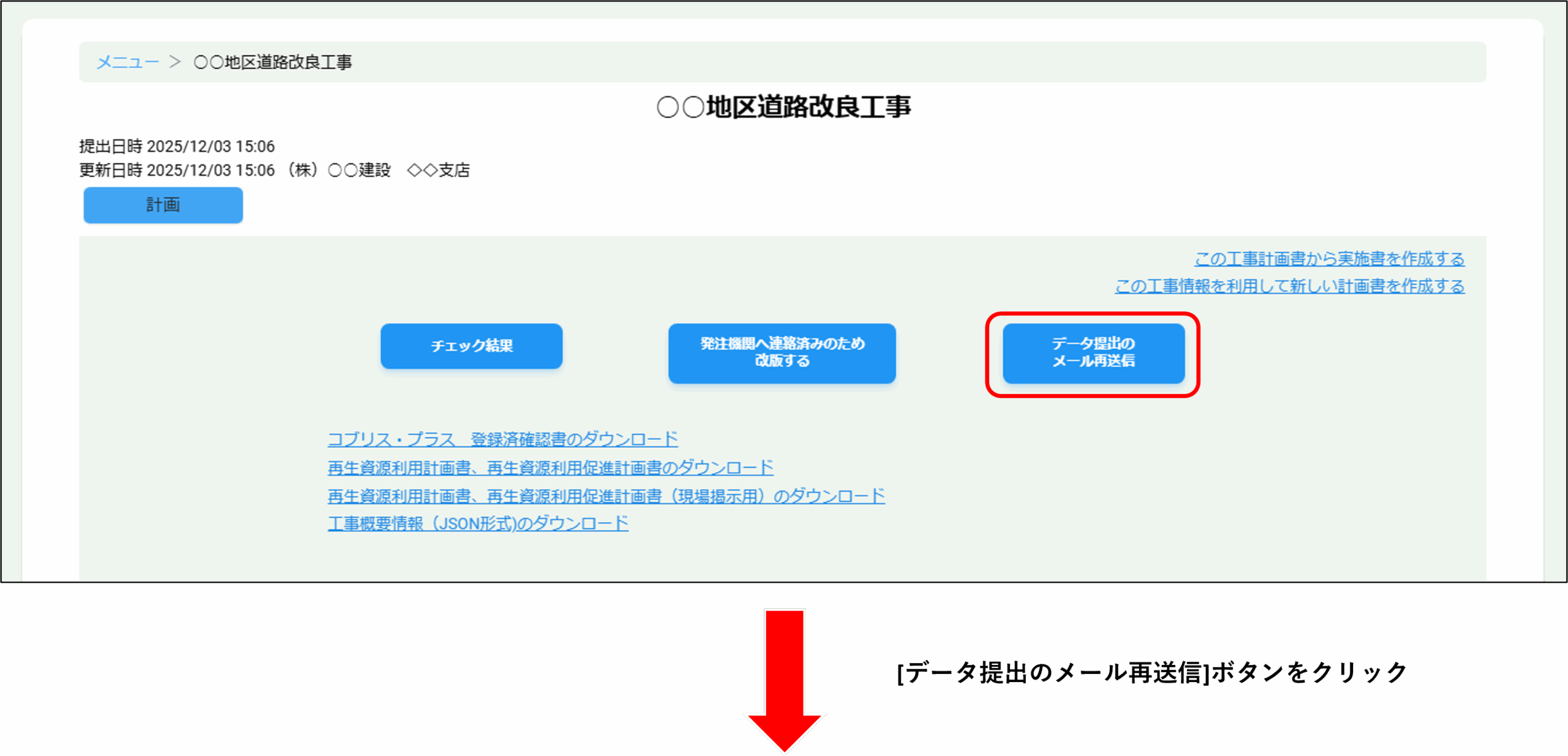 (例)計画書データの提出(メール再送信)画面
