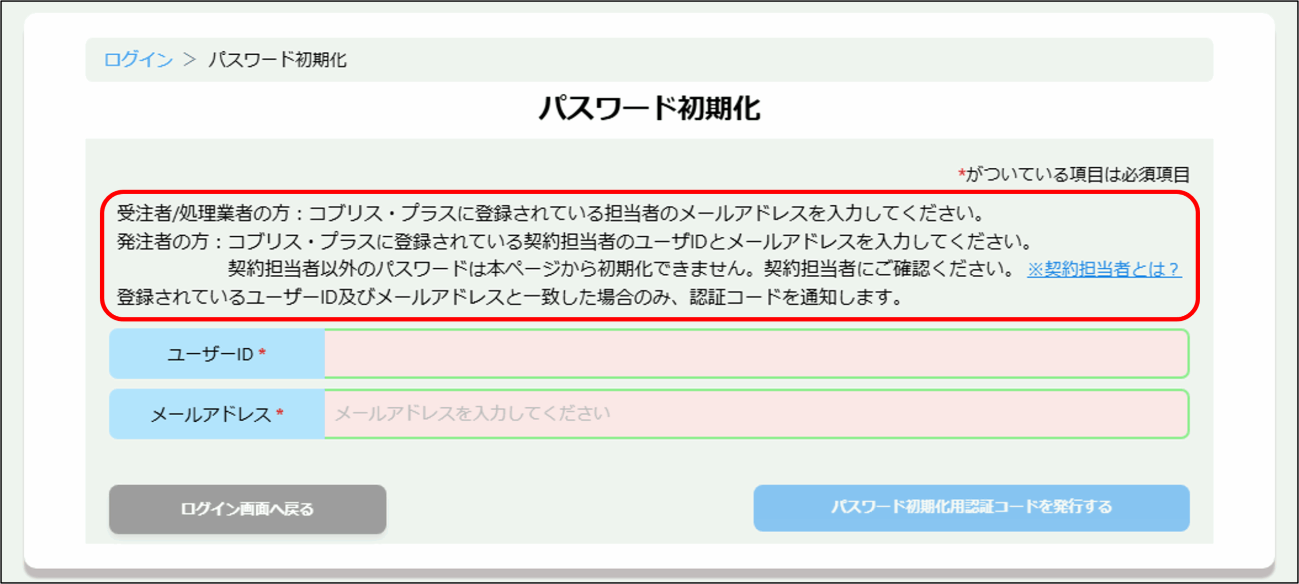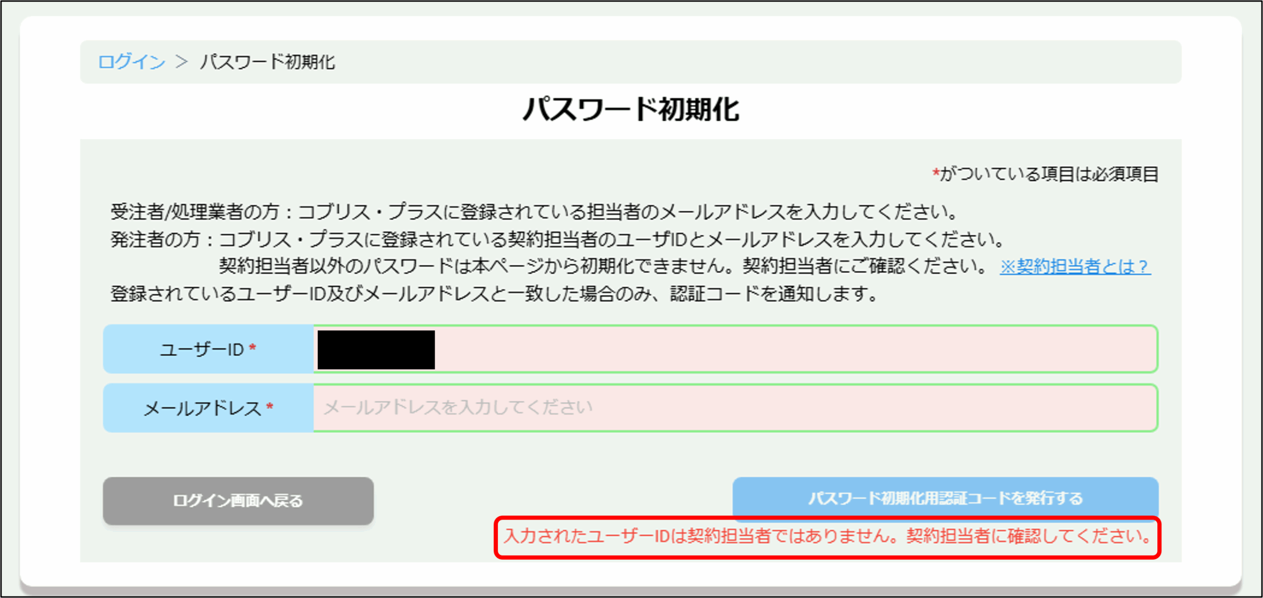 契約担当者以外の発注者の方はユーザーIDを入力した際に、