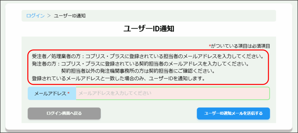 ①ユーザーID通知画面に入力するメールアドレスについての説明を記載しました。