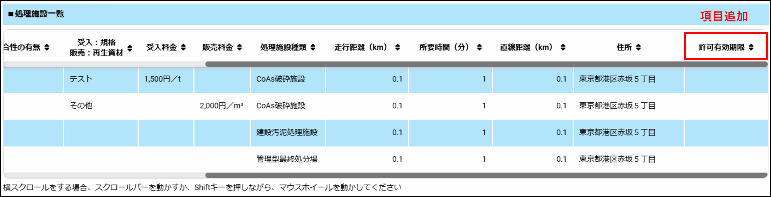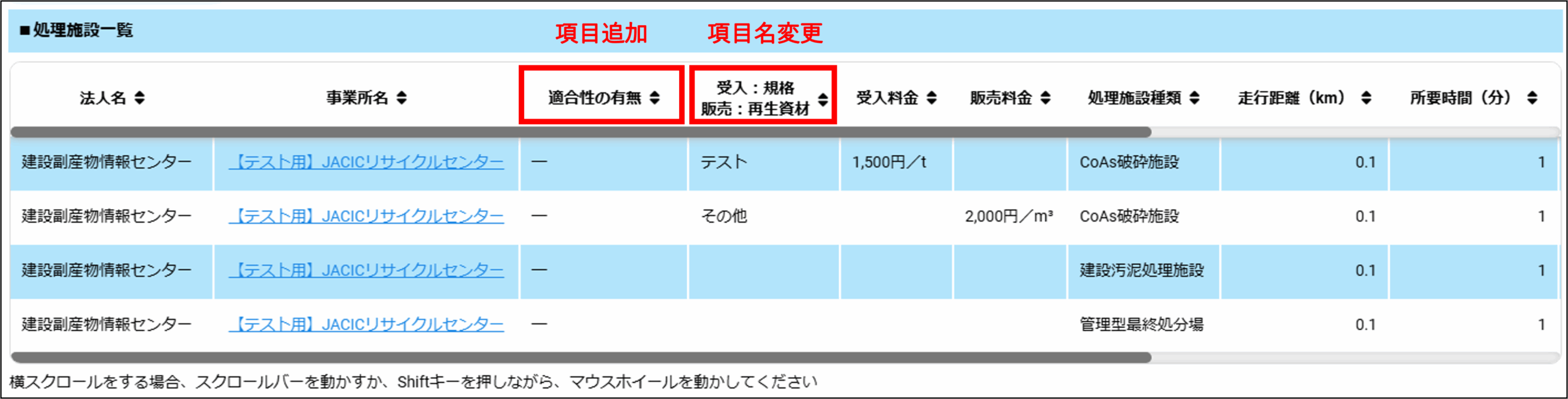 処理施設一覧に以下の項目を変更しました。